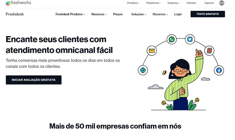 Não poderíamos falar de soluções de software de automação empresarial sem mencionar uma ferramenta de suporte ao cliente. Freshdesk é uma ferramenta movida por IA (Inteligência Artificial) para automatizar sua gestão empresarial e relações com clientes.