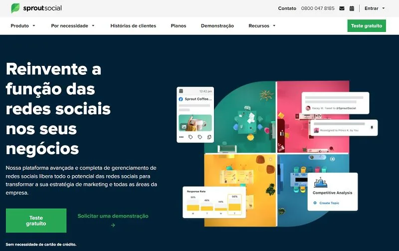 O Sprout Social é um dos principais softwares de gerenciamento de redes sociais e vem com várias ferramentas de otimização de marketing para automatizar a presença de sua empresa e alcançar KPIs. Ele se integra às plataformas de mídia social mais utilizadas para lidar com campanhas orgânicas e pagas.
