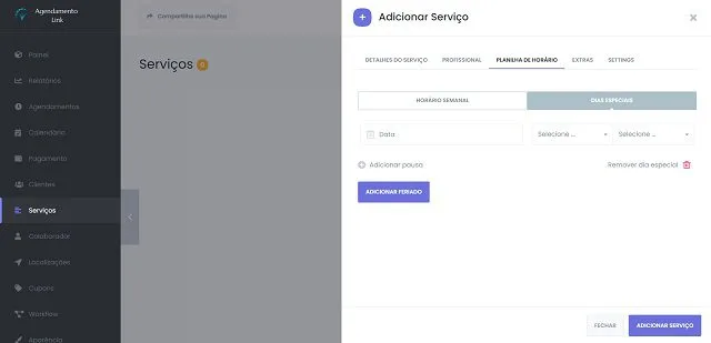 Se a planilha de seus serviços forem variar em qualquer dia, você pode incluir/excluir isso no submenu DIAS ESPECIAIS. Apenas clique no botão Adicionar Feriado e selecione a data e horas de início e finalização. Por exemplo, se um dia não for útil para sua empresa, mas o serviço precisar receber reservas, você pode adicionar esse dia ao submenu. Ou se for um dia útil para a empresa, mas o serviço não puder receber agendamentos, você pode adicionar a data do dia sem escolher nenhum intervalo de tempo. Como resultado, o dia será marcado como ocupado.