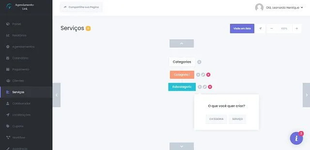 Caso queira adicionar uma subcategoria a qualquer Categoria, clique no ícone “+” ao lado. Nesse momento, será perguntado se você deseja adicionar uma nova Categoria ou Serviço. Selecione a opção Categoria e salve-a colocando o nome da subcategoria.