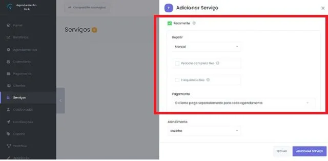 Recorrente: se você desejar adicionar serviços recorrentes, precisa ativar essa opção.