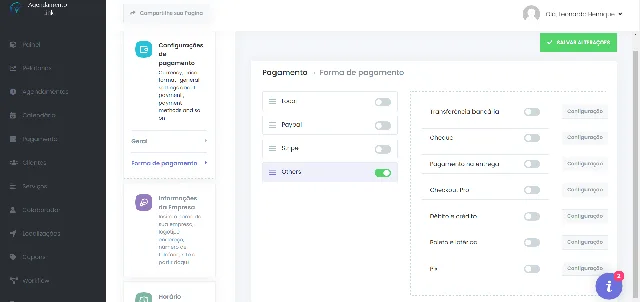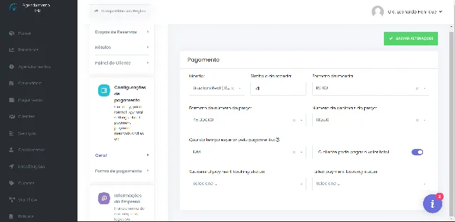 PagSeguro: se você desabilitar a opção PagSeguro, os clientes não a verão entre as opções disponíveis enquanto estiverem fazendo o agendamento e pagando por ele. Por outro lado, se você ativar essa opção, eles poderão efetuar pagamentos por meio da plataforma. Não se esqueça de verificar se o PagSeguro exige a criação de um aplicativo ou conta antes de inclui-lo em suas opções!